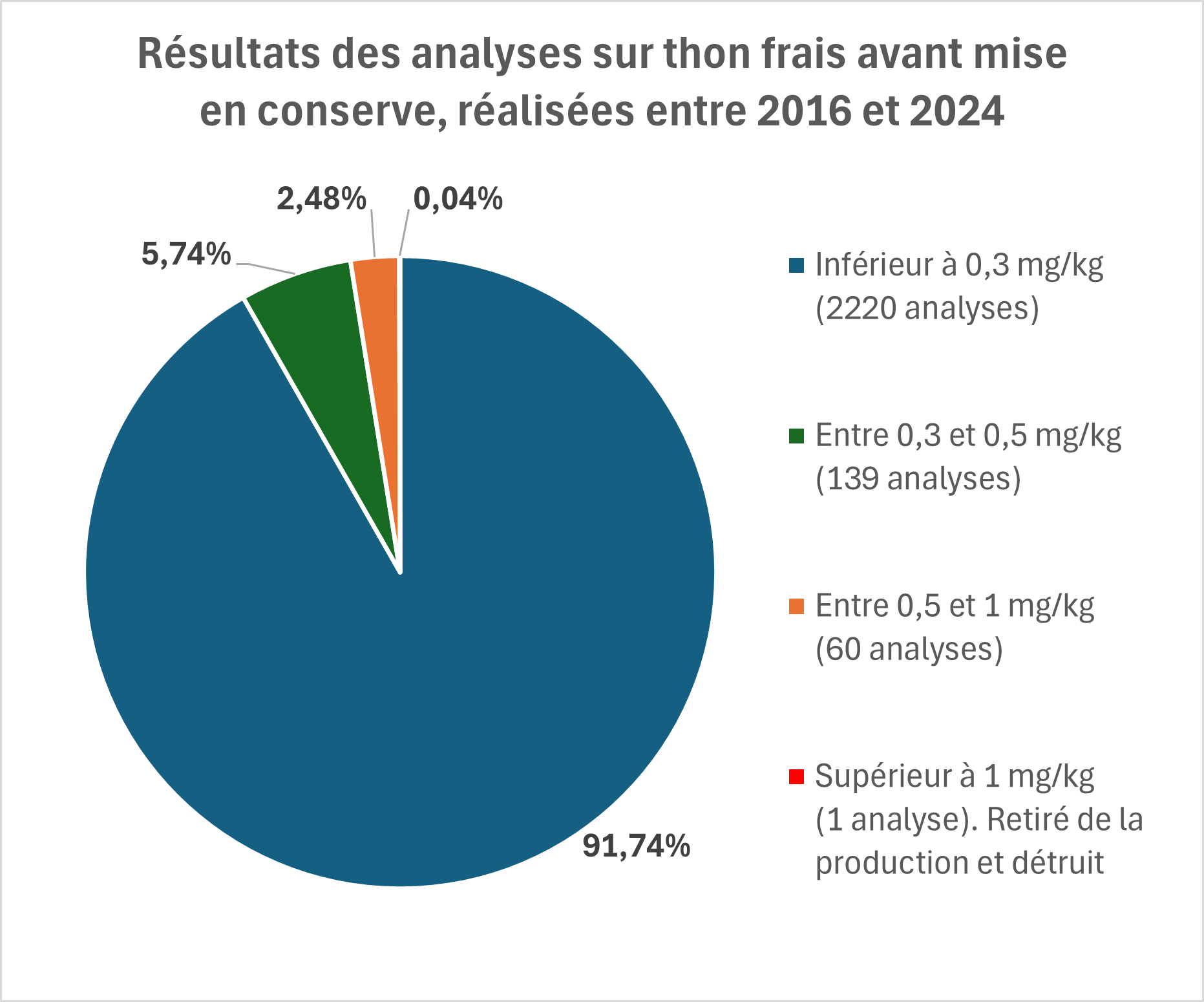 Afin de garantir la conformité de leurs produits et dans une démarche de sécurité sanitaire rigoureuse, l’ensemble des professionnels du secteur conduit préventivement et très régulièrement des centaines d’analyses chaque année, réalisées par ou avec le support de laboratoires indépendants et accrédités, selon des protocoles normés2. Ces tests sont réalisés à différents stades de la production, sur le poisson frais réceptionné par l’entreprise ou directement sur le produit fini (le thon en conserve) avant sa commercialisation. Si le produit devait dépasser le seuil réglementaire, il serait immédiatement retiré de la production et détruit.