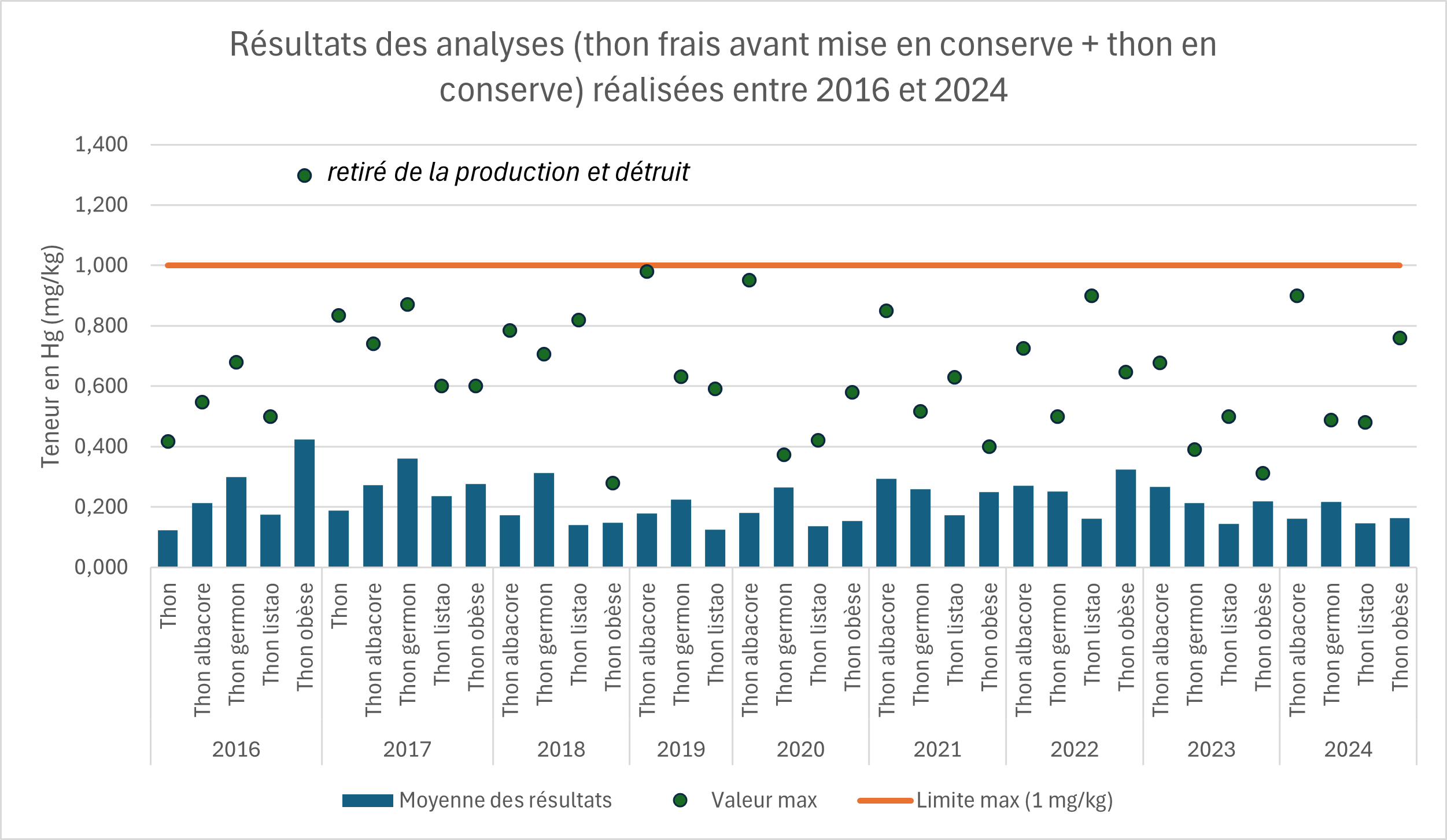 Le procédé de fabrication du thon en conserve n’a pas d’impact sur la concentration en mercure dans le thon. Les contrôles qui portent sur le thon frais lors de l’entrée en usine permettent de s’assurer de la conformité du produit dès son origine, au niveau du produit brut. Des contrôles sont également effectués sur le produit fini, le thon en conserve.
